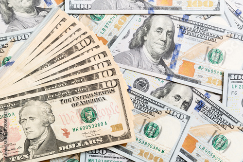 10 dollar bill on various US Dollar billss Top view of business concept on background with copy space