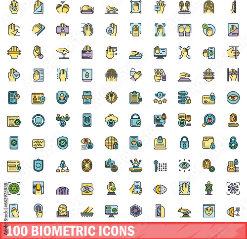 100 biometric icons set. Color line set of biometric vector icons thin line color flat on white