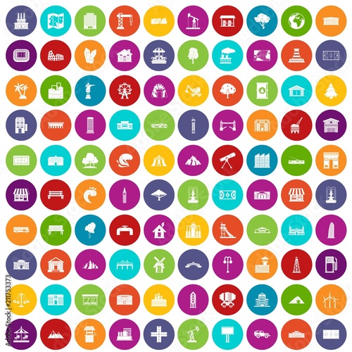 100 landscape element icons set in different colors circle isolated vector illustration