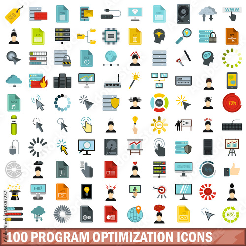 100 program optimization icons set, flat style