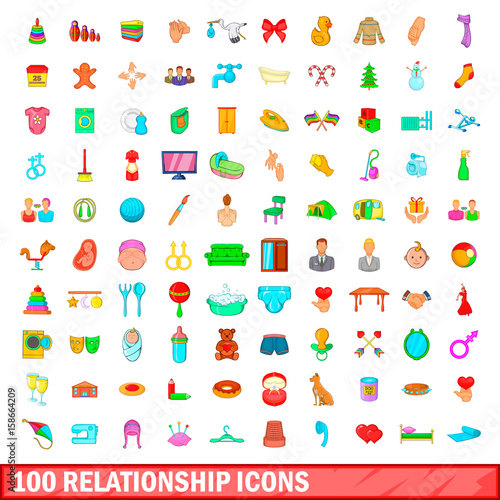 100 relationship icons set, cartoon style