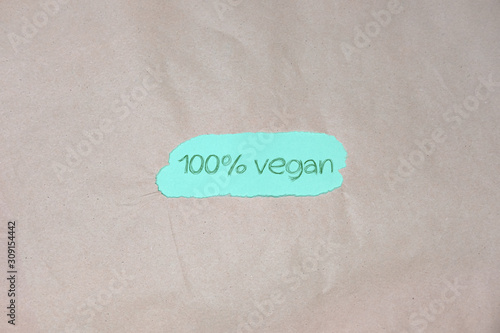"100% vegan" text on green and brown packing paper background. Recycling plastic, eco sustainable living and zero waste concept. Flat lay, top view.