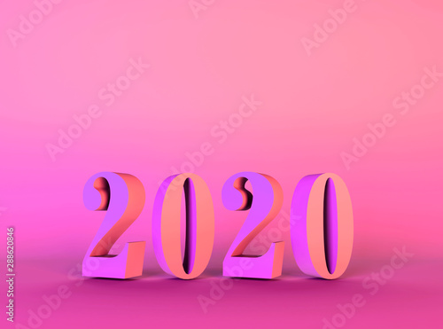 2020 numbers with shadow illuminated by bright gradient holographic lights of pink violet colors. Decoration, holiday symbol, element for design, 3D illustration. Merry Christmas Happy New Year