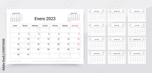 2023 calendar planner. Spanish calender template. Week starts Monday.. Table schedule grid with 12 month. Yearly organizer layout. Horizontal monthly diary. Vector simple illustration. Paper size A5.
