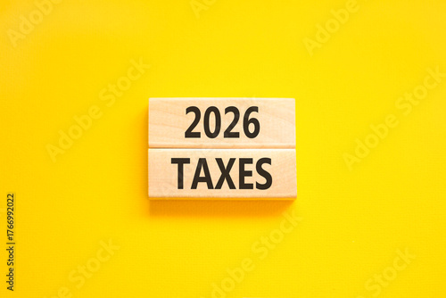 2026 taxes new year symbol. Concept words 2026 taxes on beautiful wooden blocks. Beautiful yellow paper background. Business and 2026 taxes new year concept. Copy space.