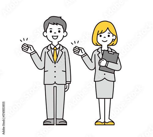 手を添えて案内する、20代・30代のビジネスマンの男性と女性の全身ベクターイラスト素材セット