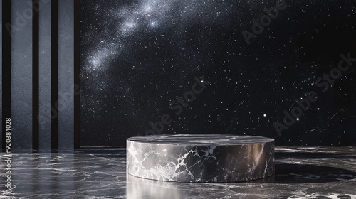 240804 145. Cylindrical stand podium for displaying the product on any background in any environment, starry night sky reflected on polished marble slab platform, geometric pattern wallpaper with