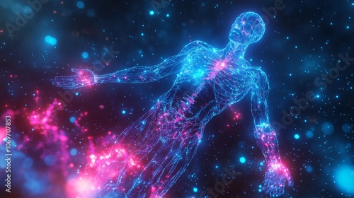 2410_009.bio-digital human anatomy render, ethereal blue transparent body, radiant pink pain indicators, glowing skeletal framework, neural network visualization, quantum medical imaging style,