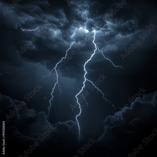 25. Lightning bolts illuminating a dark sky during a heavy storm, extreme weather, intense energy