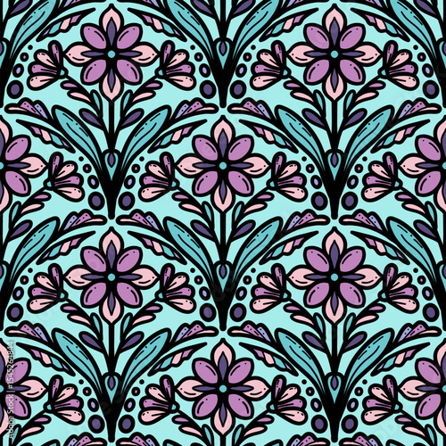 250651 colorful line floral scribble seamless scallop pattern, motifs floral hand drawn, scribble style, scallop pattern, design for seamless floral pattern, printing, wrapping, background and craft