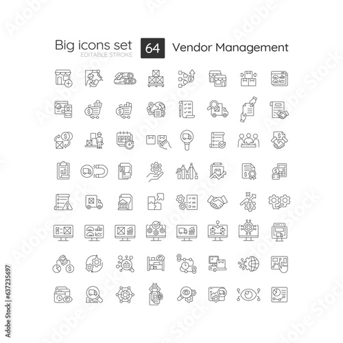 2D editable black big line icons set representing vendor management, isolated vector, linear illustration.
