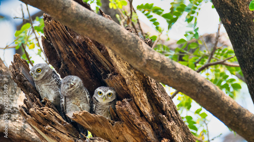 3 birds that live as families are located in the hollows of trees with a white background.Spotted owlet are natural wildlife. Resident of open habitats including farmland and human habitation.