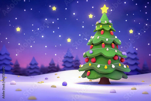 3D Cartoon Christmas Tree with Lights and Star in Snowy Night Landscape with Stars in Sky.