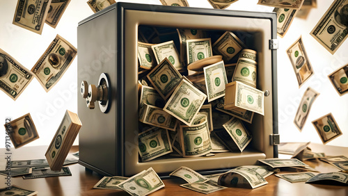 3D Floating Safe Box and Dollar Bills Concept - Modern Vector Symbolizing Financial Security and Profits - Illustration of Weightless Savings and Minimalist Style - White Background