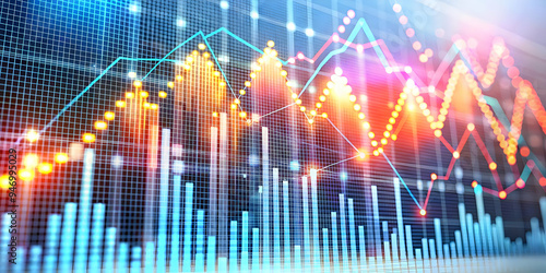 3D Glowing Abstract Financial Report with Rising and Falling Data Points Concept - Market Volatility Symbolized with Data Points Movement on White Background