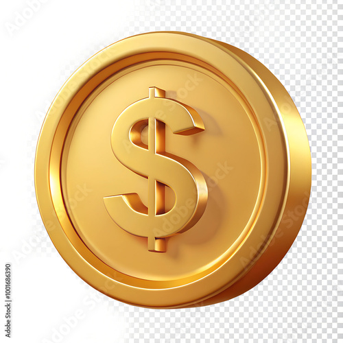 3D gold coin with '$' symbol, financial concept, floating on transparent background