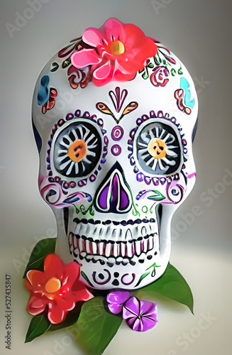 3D illustration of a floral decorated Day of the Dead (Dia de los Muertos) sugar skull, or calavera.