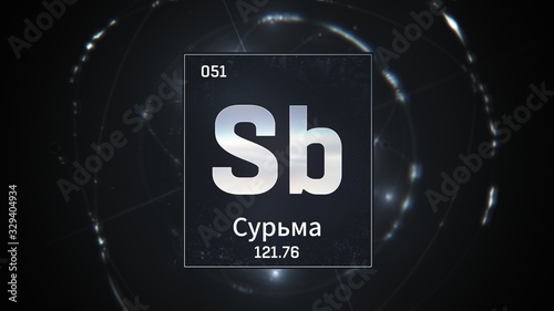 3D illustration of Antimony as Element 51 of the Periodic Table. Silver illuminated atom design background orbiting electrons name, atomic weight element number in russian language