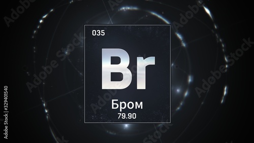 3D illustration of Bromine as Element 35 of the Periodic Table. Silver illuminated atom design background orbiting electrons name, atomic weight element number in russian language