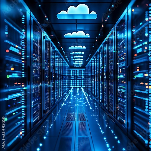 3D Illustration of Cloud Computing Data Center with Servers and Blue Lights