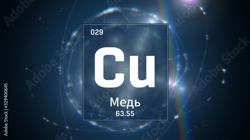 3D illustration of Copper as Element 29 of the Periodic Table. Blue illuminated atom design background orbiting electrons name, atomic weight element number in russian language