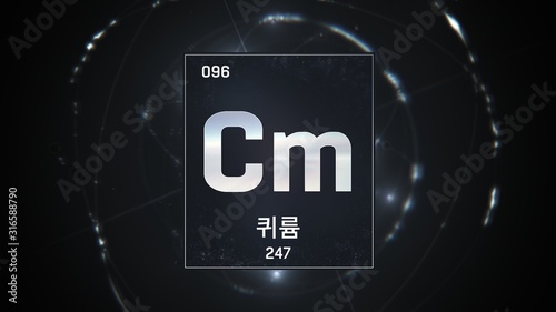 3D illustration of Curium as Element 96 of the Periodic Table. Silver illuminated atom design background with orbiting electrons name atomic weight element number in Korean language
