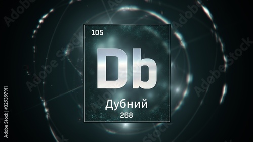 3D illustration of Dubnium as Element 105 of the Periodic Table. Green illuminated atom design background with orbiting electrons name atomic weight element number in russian language