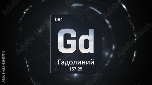 3D illustration of Gadolinium as Element 64 of the Periodic Table. Silver illuminated atom design background with orbiting electrons name atomic weight element number in russian language