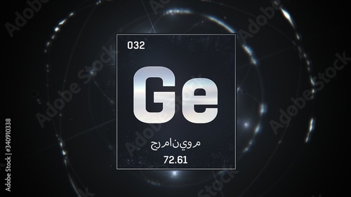 3D illustration of Germanium as Element 32 of the Periodic Table. Silver illuminated atom design background orbiting electrons name, atomic weight element number in Arabic language