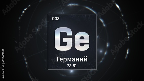 3D illustration of Germanium as Element 32 of the Periodic Table. Silver illuminated atom design background orbiting electrons name, atomic weight element number in russian language