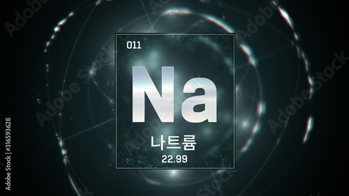 3D illustration of Neon as Element 10 of the Periodic Table. Silver illuminated atom design background orbiting electrons name, atomic weight element number in Korean language