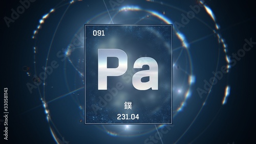 3D illustration of Protactinium as Element 91 of the Periodic Table. Blue illuminated atom design background with orbiting electrons name atomic weight element number in Chinese language