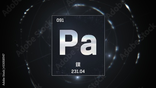 3D illustration of Protactinium as Element 91 of the Periodic Table. Silver illuminated atom design background with orbiting electrons name atomic weight element number in Chinese language