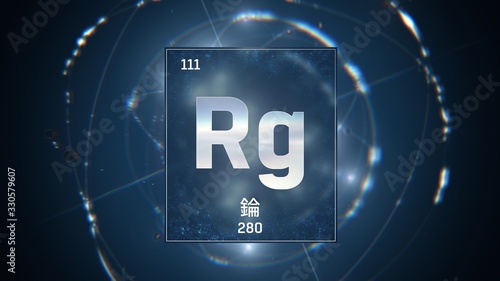 3D illustration of Roentgenium as Element 111 of the Periodic Table. Blue illuminated atom design background with orbiting electrons name atomic weight element number in Chinese language