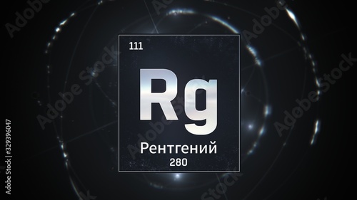 3D illustration of Roentgenium as Element 111 of the Periodic Table. Silver illuminated atom design background with orbiting electrons name atomic weight element number in russian language