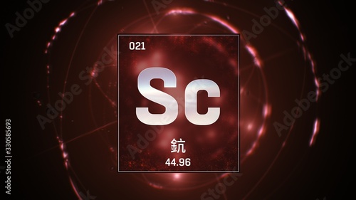 3D illustration of Scandium as Element 21 of the Periodic Table. Red illuminated atom design background orbiting electrons name, atomic weight element number in Chinese language