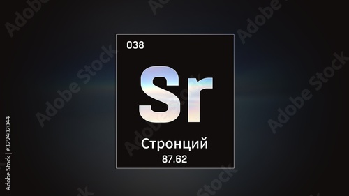 3D illustration of Strontium as Element 38 of the Periodic Table. Grey illuminated atom design background orbiting electrons name, atomic weight element number in russian language