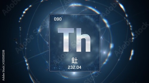 3D illustration of Thorium as Element 90 of the Periodic Table. Blue illuminated atom design background with orbiting electrons name atomic weight element number in Chinese language