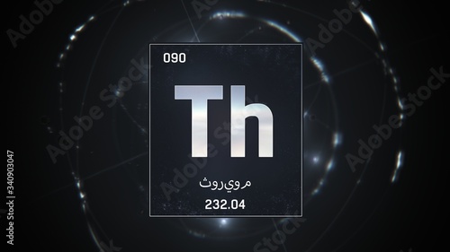 3D illustration of Thorium as Element 90 of the Periodic Table. Silver illuminated atom design background with orbiting electrons name atomic weight element number in Arabic language