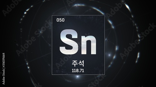 3D illustration of Tin as Element 50 of the Periodic Table. Silver illuminated atom design background orbiting electrons name, atomic weight element number in Korean language