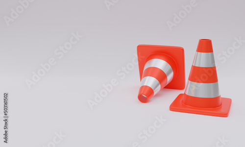 3d illustration, traffic safety cones, light background, copy space, 3d rendering.