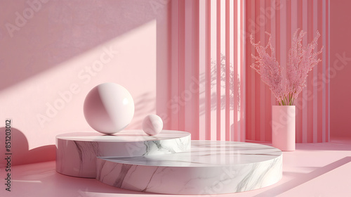 3d interior ball and marble podium with sunlight and pink background