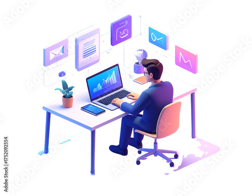 3D Isometric Remote Work Setup, Transparent Background PNG