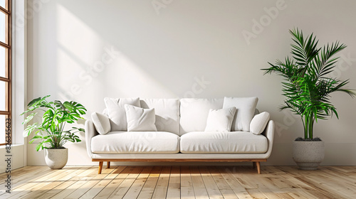 3D mockup of a modern living room with a white wall, green plants, and contemporary furniture