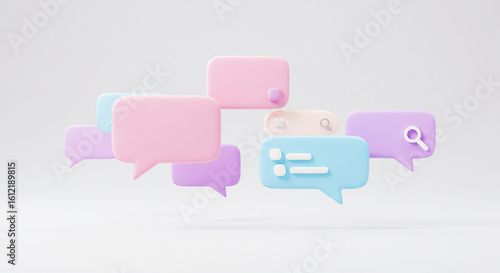 3D Pastel Chat Bubbles with Search and Checklist Icons: A minimalist render for social media communication, planning, online search, and dialogue concepts