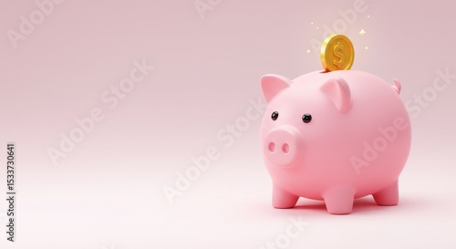 3D piggy bank with glowing gold coins, gradient pastel background from soft pink to white