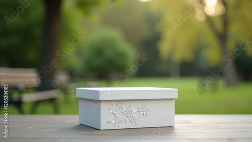 3D Printed Box Mockup, 3D printed box with floral engravings outdoors trees and benches no blur.