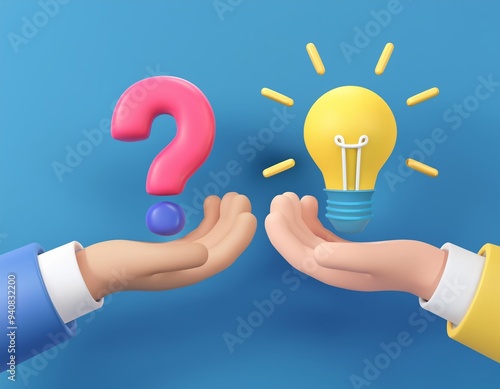 3D question mark and a lightbulb are held out by two hands, 3D illustration
