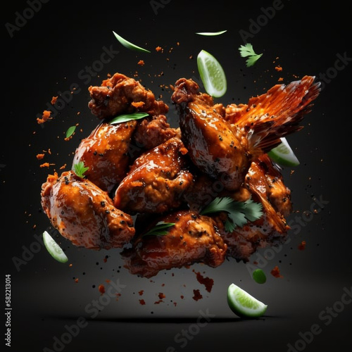 3D Realistic Rendering of Spicy Chicken Wings Flying on Black Background generative ai
