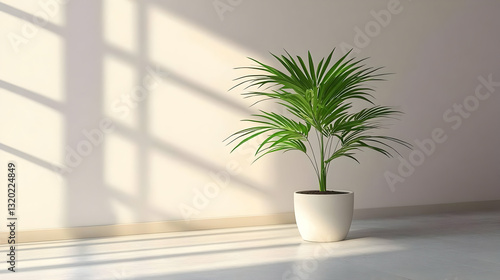3D Render of a Green Palm Plant in a White Pot, Sunlit Room with Minimalist Interior Design